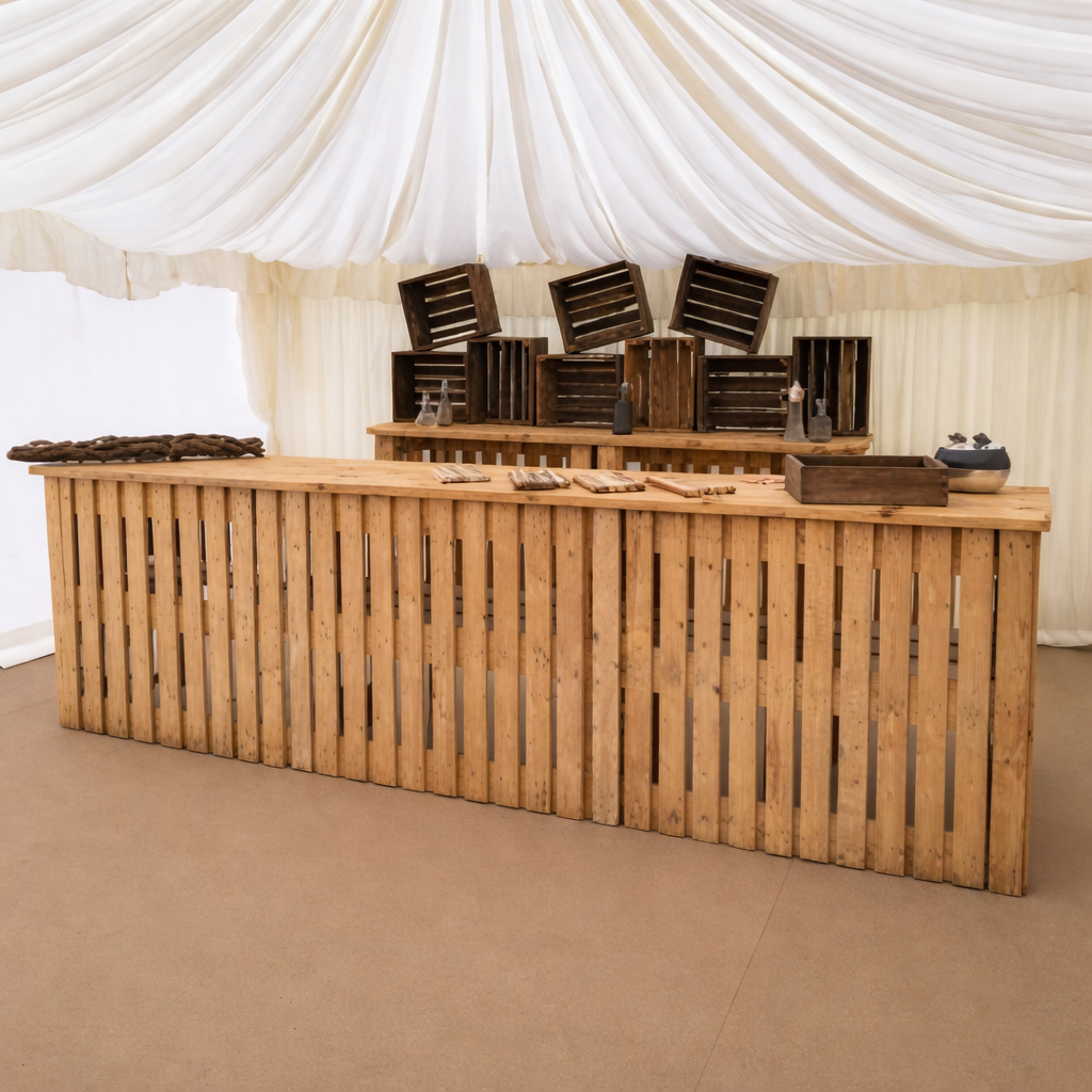 This unusual style bar resembling a collection of wooden pallets is a great way to incorporate the bar area into your theme, instead of it being on the periphery. The wooden look works well with Apres Ski or Western themes and the bar gives off a casual, relaxed feel.