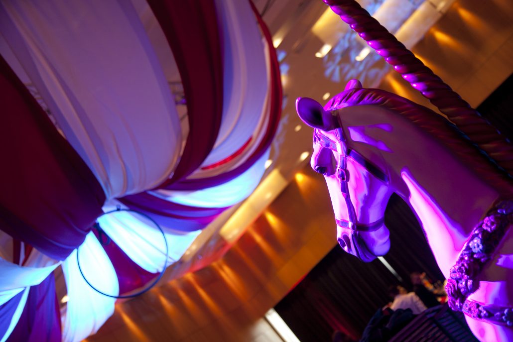 Bold colours, striking props and dramatic styling transform the space into a vibrant and playful circus environment.