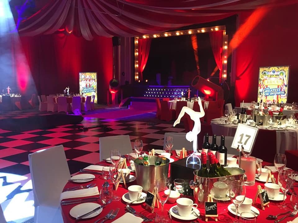 Bold, vibrant and full of energy — circus theming transforms the space with dramatic props, colour and immersive styling.