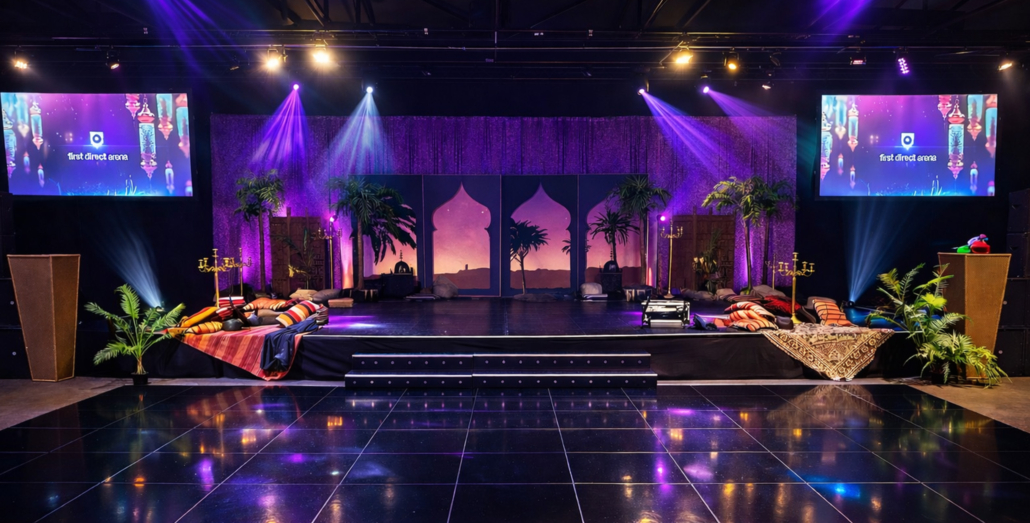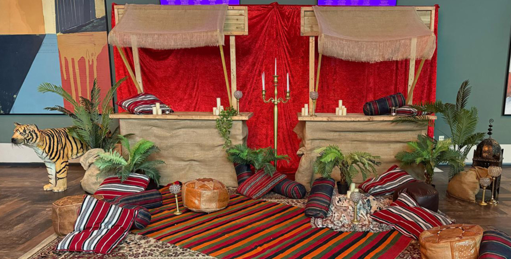 Luxurious fabrics, lanterns and themed props create a magical Middle Eastern setting filled with colour and atmosphere.