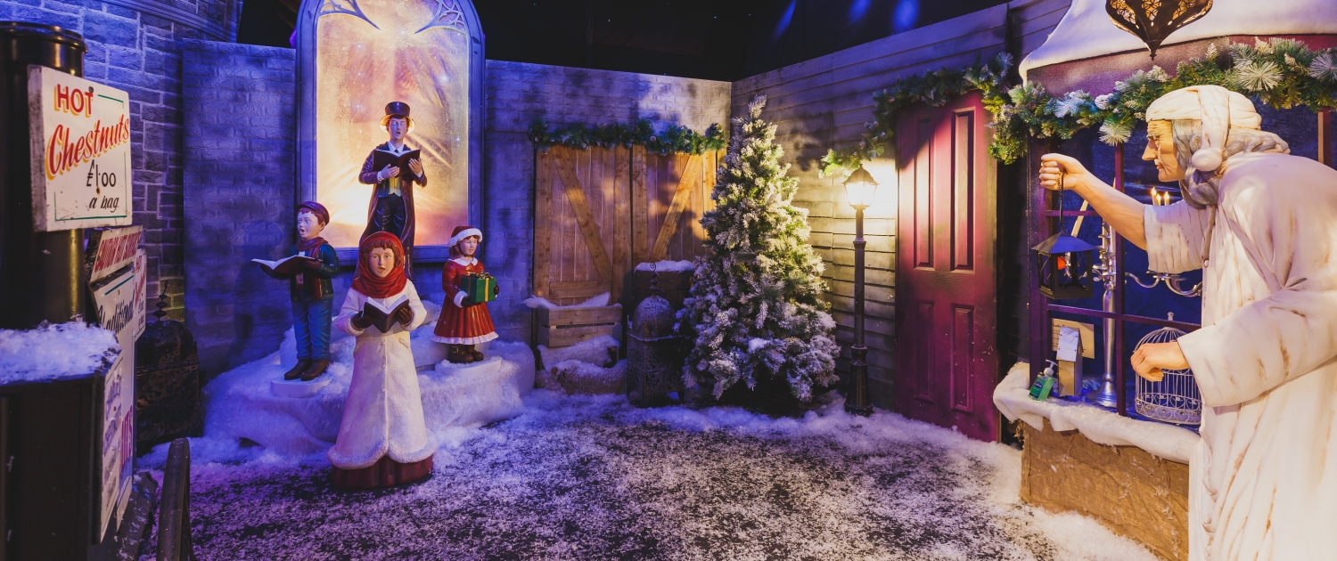 A historical twist featuring vintage street lanterns, cobbled street visuals, carol singers, gaslight-style lighting and period décor. Ideal for heritage venues or experiential Christmas trails.