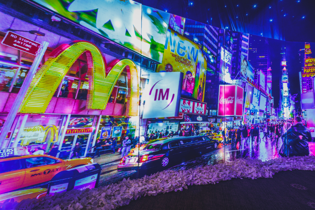 NYC skyline backdrops, yellow taxi props, and Times Square visuals