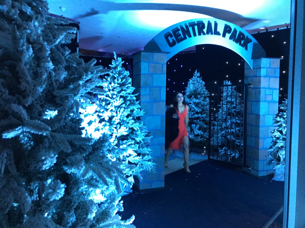 Iconic Central Park-inspired decor – park benches, snow-laden trees, and lampposts