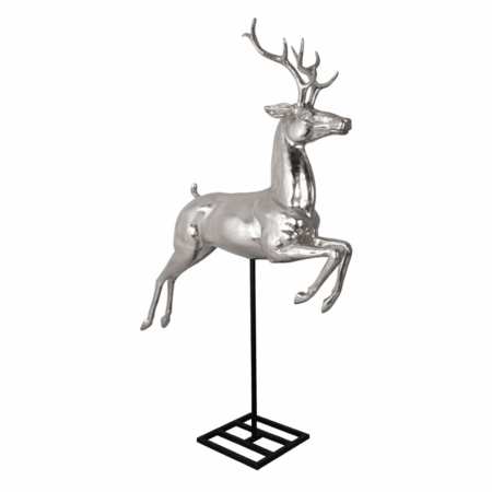 Snow is falling from above, traditional streetlamps light the way to one side of the room where our magnificent frozen wonderland stage set stands tall, with its twinkling white star cloth and grand ice turrets. In another corner our life sized reindeer stand beside a magical silver sledge – perfect for photo opportunities later.